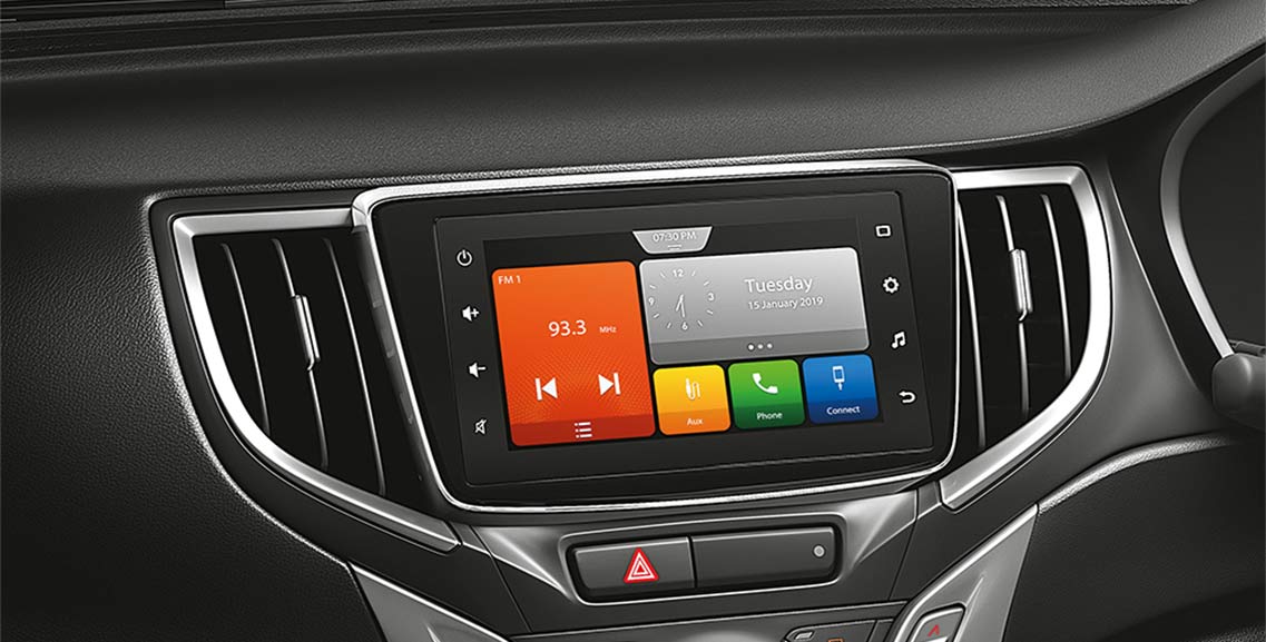 It features state-of-the-art Smartplay Studio that lets you text, call, navigate, listen to music and much more, all with one touch. The Smartplay system can also function using the Mounted Auto Controls on the steering wheel. You can even simply use your voice for the same. Moreover, you can now toggle between these functions with ease by simply connecting it to your smartphone which will make for an even smoother experience. The Tilt & Telescopic Steering allows you to adjust the steering column according to your convenience so that you feel nothing but comfort as you drive into the night. The coloured TFT Multi Information Display is another convenient feature in the bold Baleno that gives you a complete overview of everything that is happening in the car.